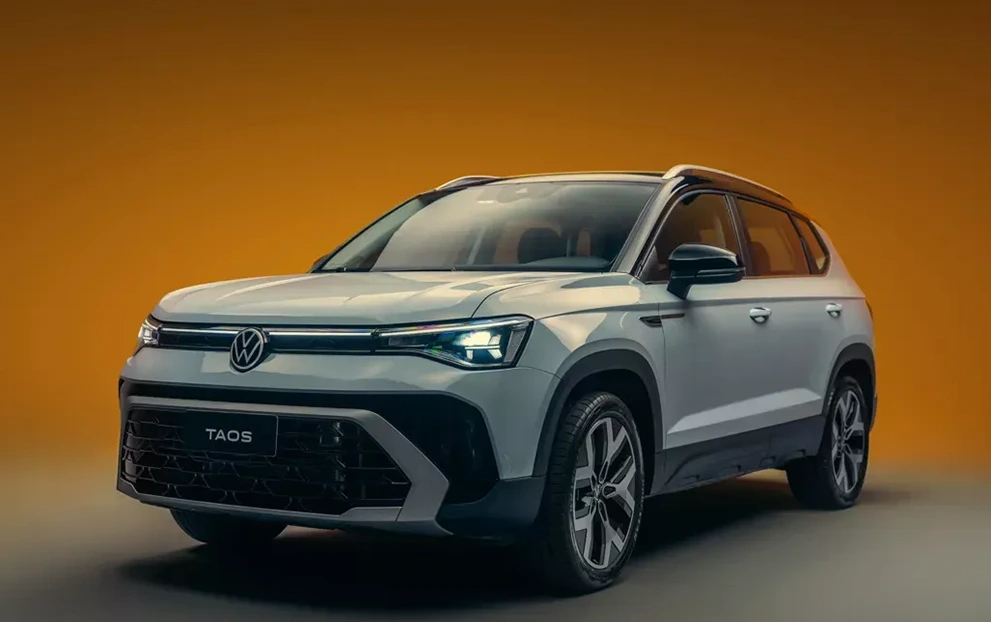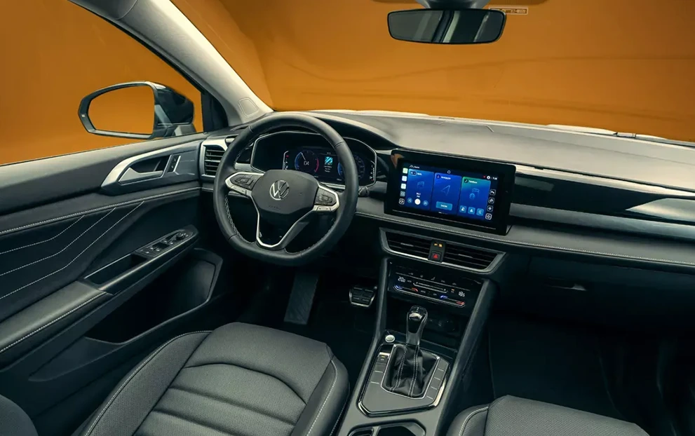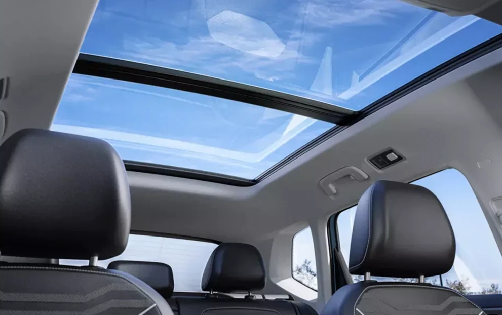 O teto solar panorâmico do Novo Taos amplia a sensação de espaço e preenche a cabine com luz natural, criando uma atmosfera mais arejada e acolhedora para todos os ocupantes. A abertura generosa conecta o interior ao cenário externo, tornando cada viagem mais leve e prazerosa — seja na cidade, na estrada ou em momentos especiais.